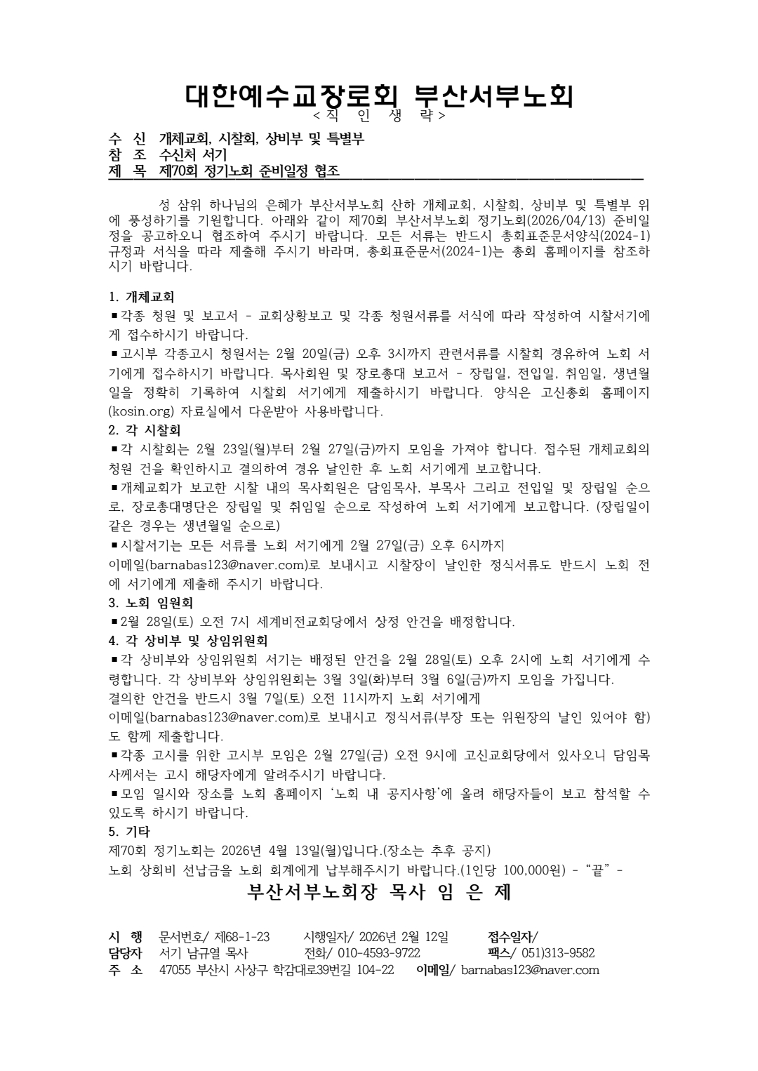제70회 정기노회 준비일정 협조 공문