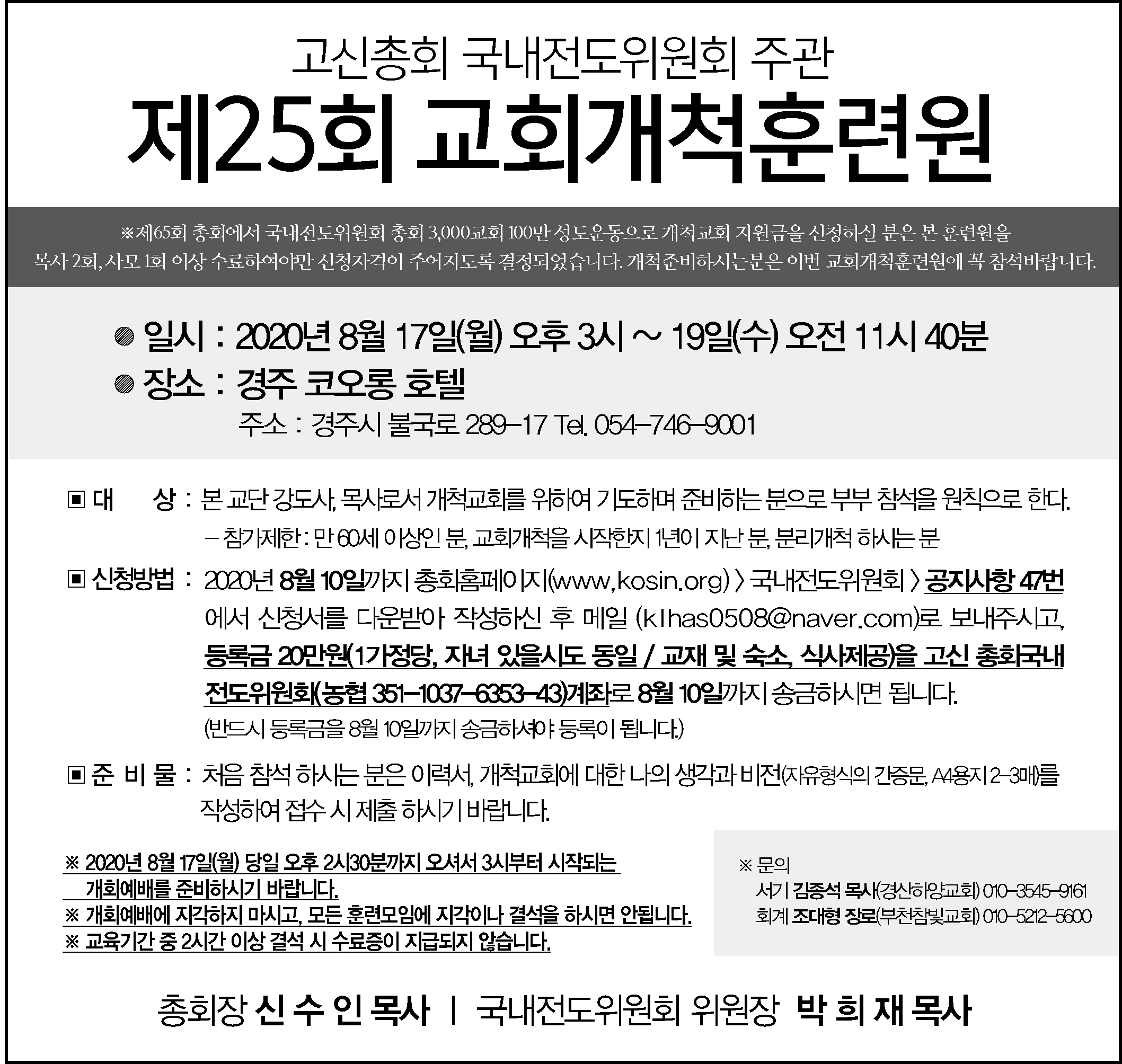 | 49 | 제26회 교회개척훈련원 안내 | 전도부 | 2020.11.04 | 1168 |