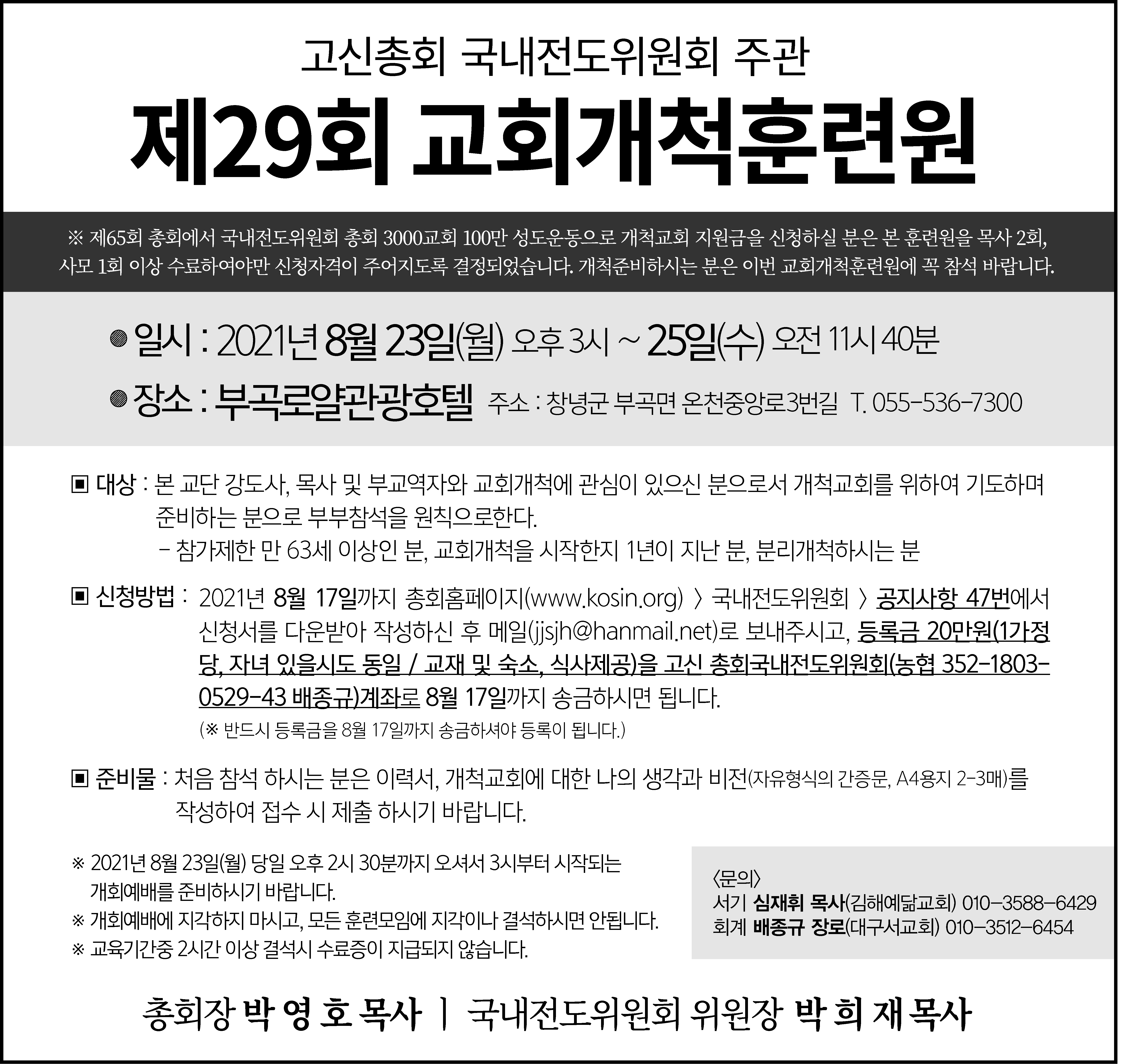 | 54 | 제30회 교회개척훈련원 안내 | 전도부 | 2021.11.02 | 1194 |