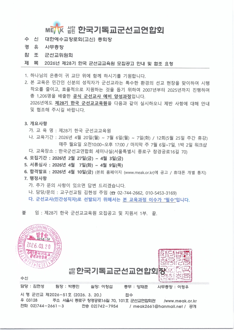 » [한국기독교군선교연합회]2026년 제28기 한국 군선교교육원 모집공고 안내 및 협조 요청 file kosin 2026.03.30 380