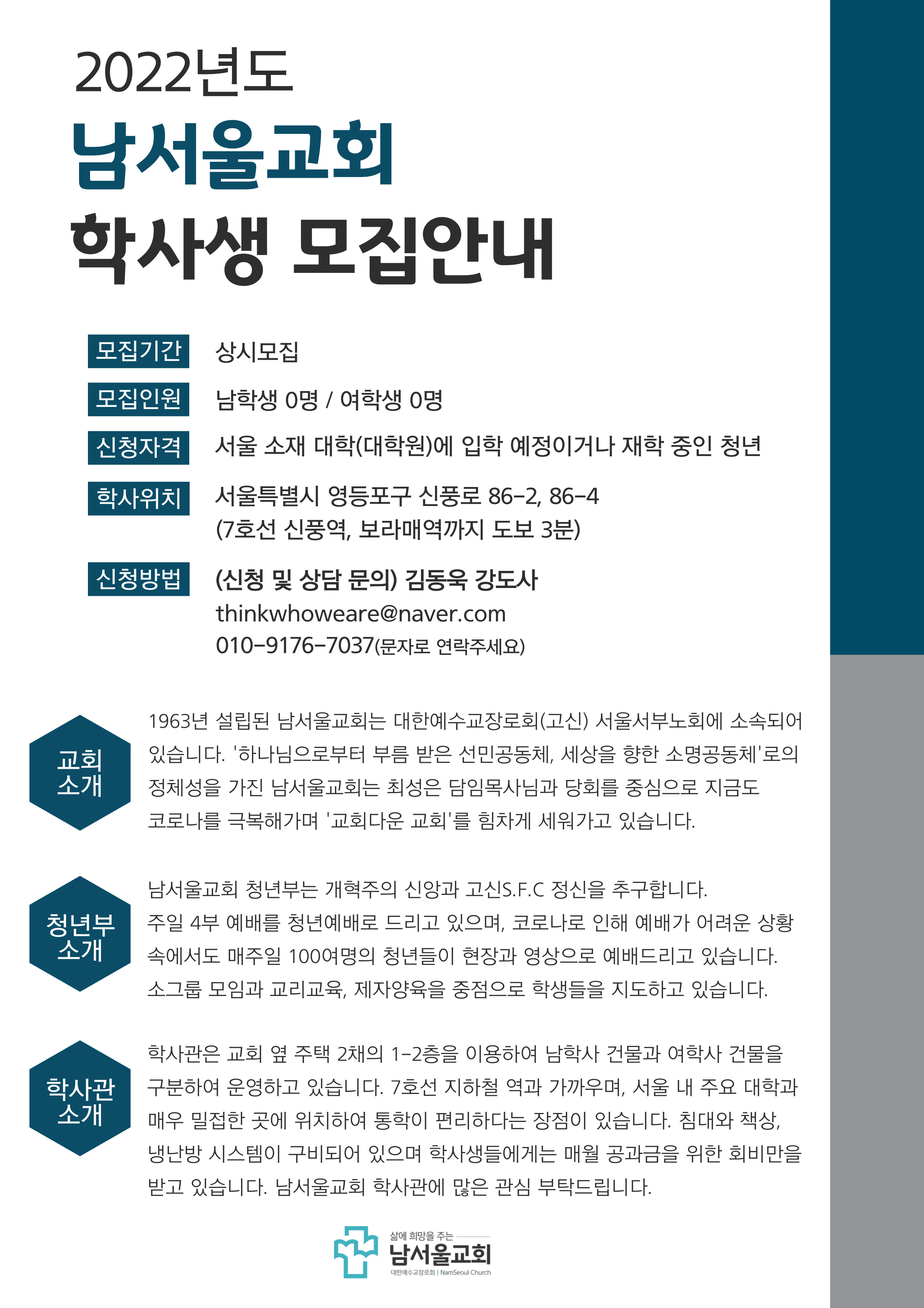 » 2022년도 남서울교회 학사생을 모집합니다. file 김동욱 2022.01.25 3014