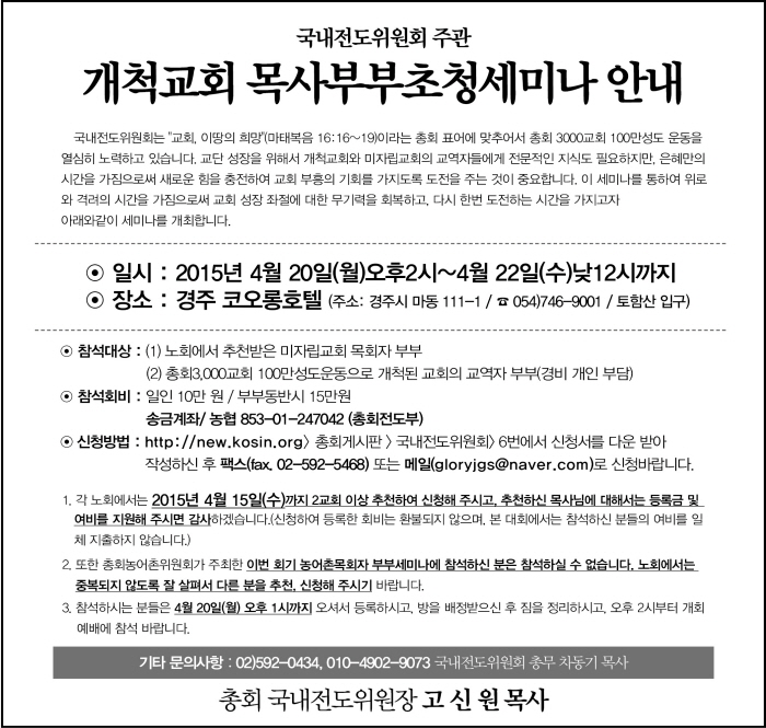 62 2015년 국내전도위원회 제3회 교회개척훈련원 안내 관리자 2015.10.30 1117