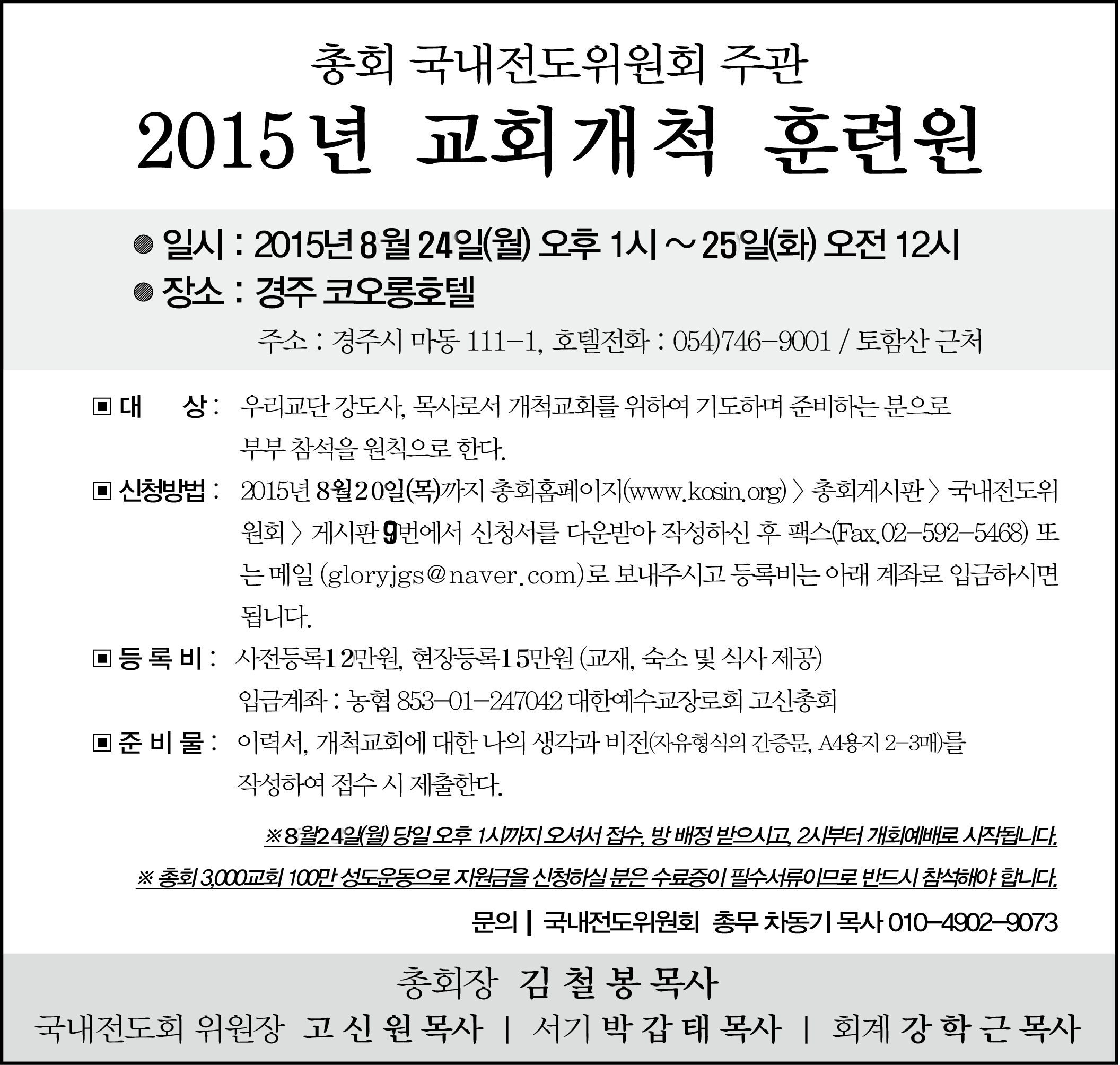 62 2015년 국내전도위원회 제3회 교회개척훈련원 안내 관리자 2015.10.30 1117