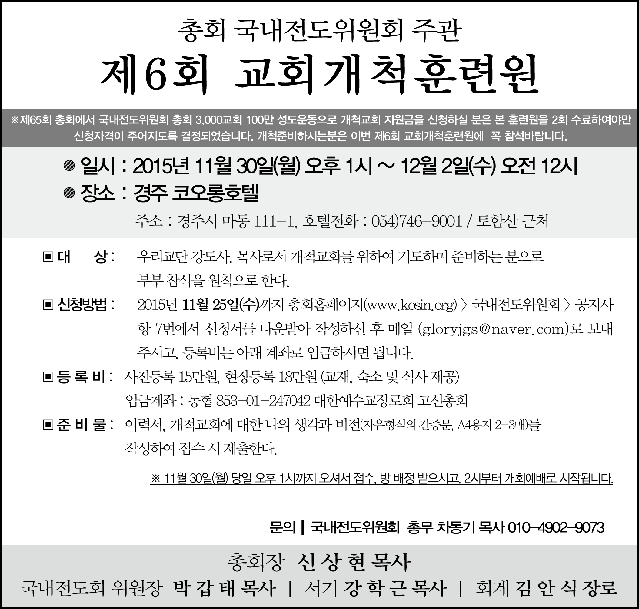 » 제6회.교회개척훈련원 안내_2015.11.30(월)~12.02(수) _ 신청서 첨부되어 있습니다... file 관리자 2015.11.09 1227