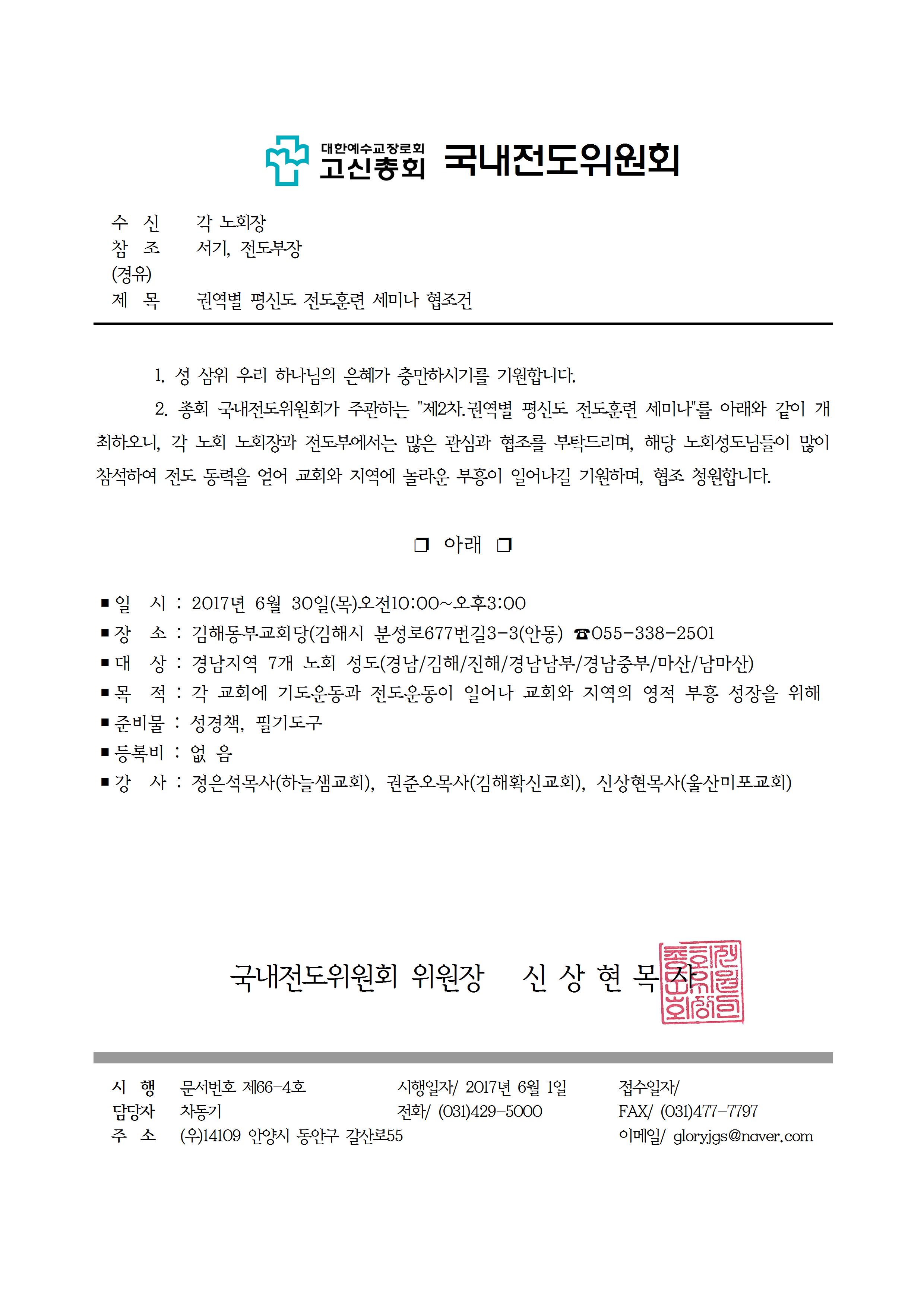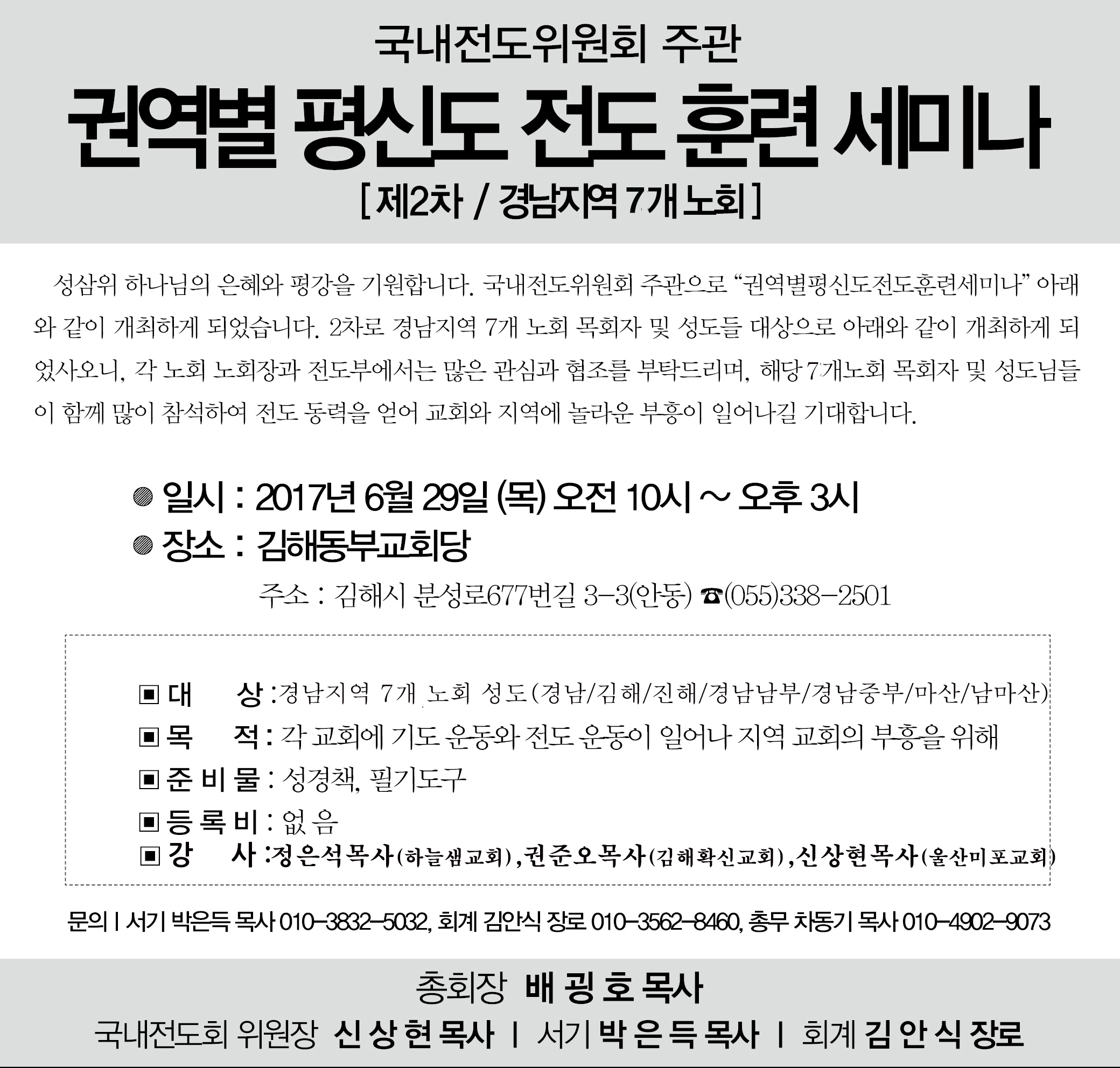 24 국내전도위원회 주관 권역별 [대구,경북지역 6개노회] 평신도전도훈련세미나 협조건 file 하사랑 2017.03.04 772